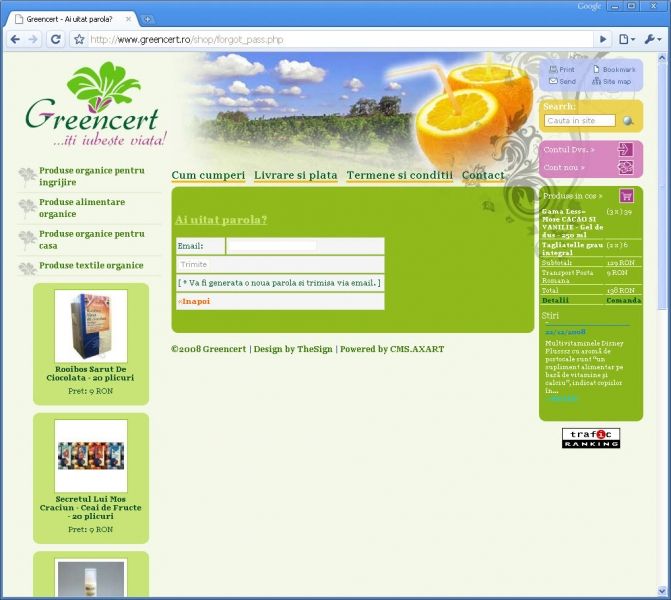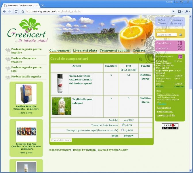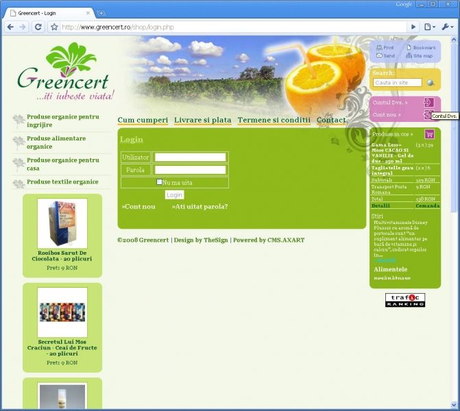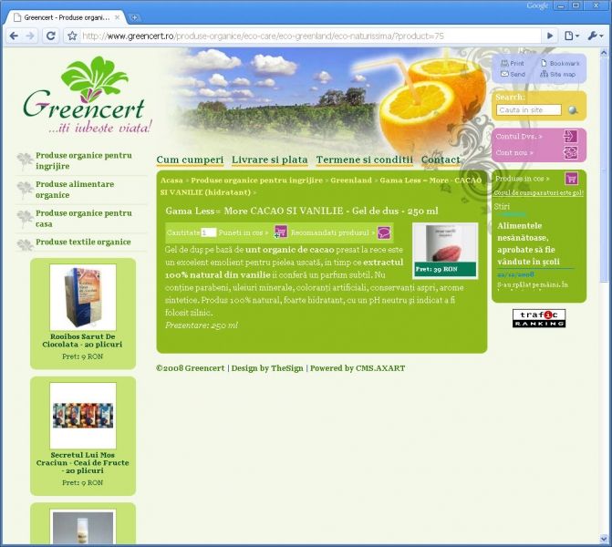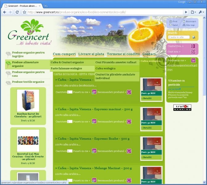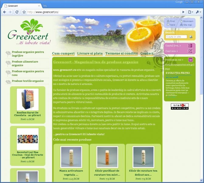 Customer Greencert is an online store that offer visitors a wide range of organic products. With an initial structure comprising Care organic products, organic food, organic products for domestic organic textile products, the site offers easy access to high quality products with reasonable prices, products which are environmentally friendly and shows responsibility social. Greencert wants to bring its customers a taste of nature and harmony. Site Design Chromatics "natural" ergonomic layout and navigation areas, Presentation, cumpataruri basket, client account first message transmitted visitor a visual - balance, detachment, calm - creating a relaxed atmosphere conducive to shopping in a modern online store. The result - the online shop Please visit the website www.greencert.ro.