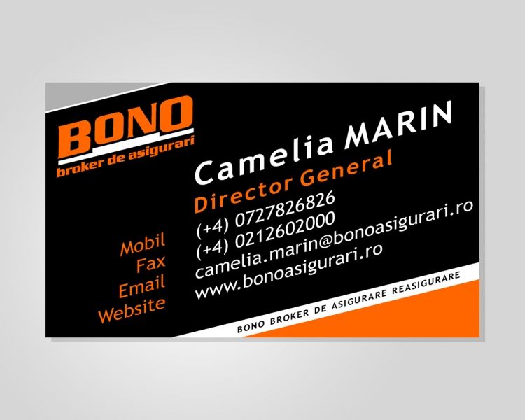 Pentru BONO - broker de asigurare am creat sigla companiei impreuna cu cartile de vizita. Un alt element interesant a fost crearea unei stampile bicolore in care sa fie inclusa sigla companiei.